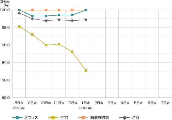 賃貸可能面積は、小数第3位を四捨五入して記載しています。なお、各不動産及び信託不動産の賃貸可能面積に本投資法人が保有する権利の割合を乗じて面積を記載しています。また、稼働率は、小数第2位以下を四捨五入しています。