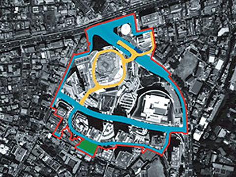 計画地の中央にはテレビ朝日の敷地が広がっており、南側の木造を中心とした低層住宅が密集して立ち並ぶ住宅地とは15m以上の高低差がありました。