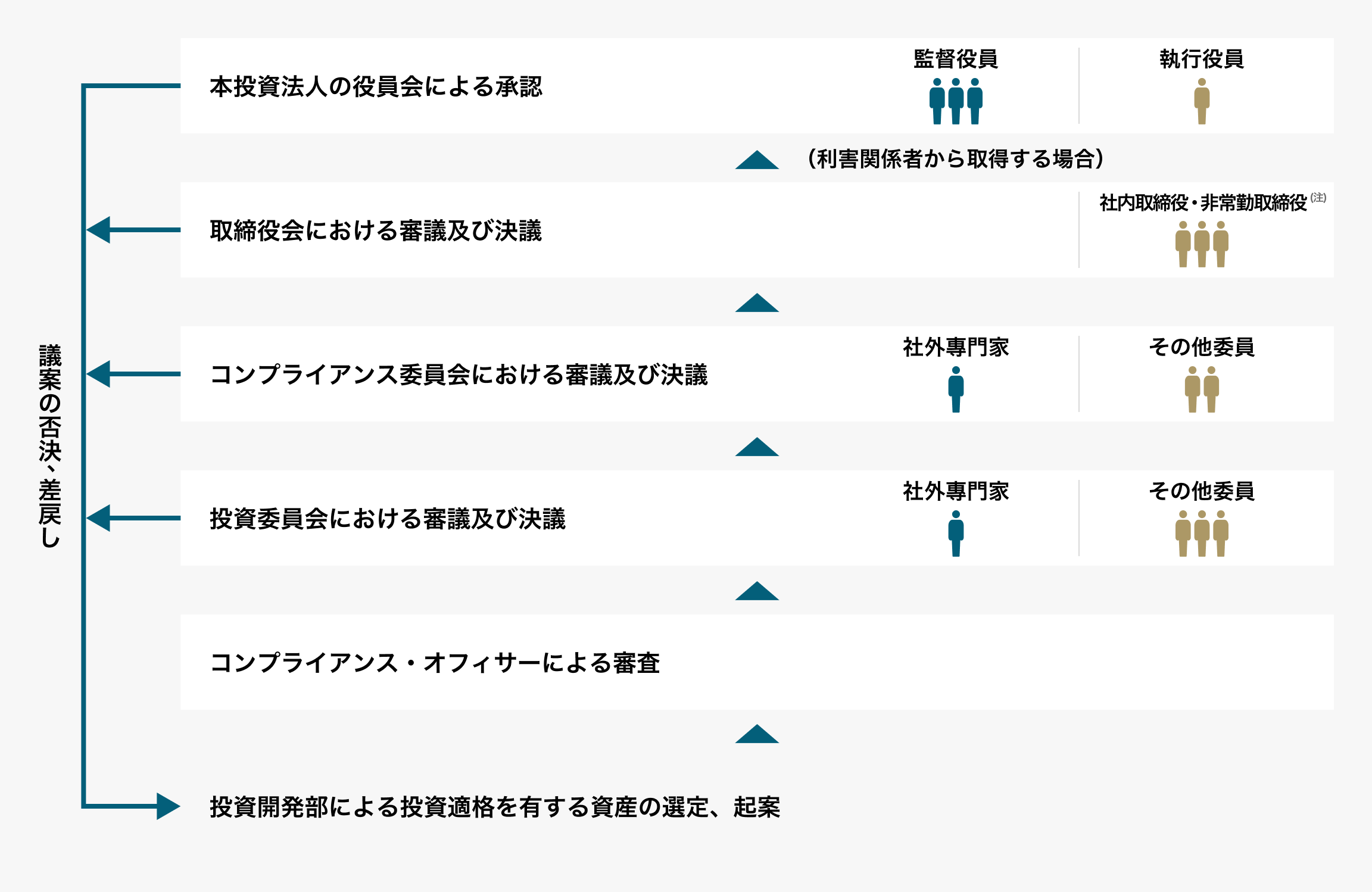 - 利害関係者からの取得において、取締役が当社の親会社又は当該利害関係者の役職員(兼職の場合を含み、当社に出向又は転籍している場合を除く。)である場合、当該取締役は取締役会の決議に加わることはできません。